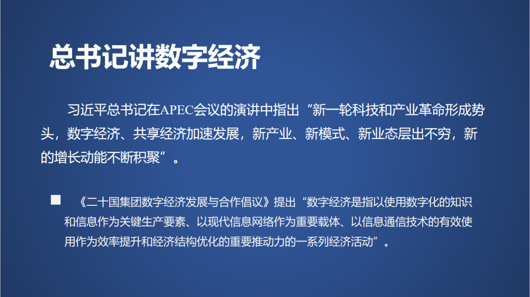 “数字经济”是习总书记在APEC会议上第一次提的,他说:新一轮科技和产业革命形成势头,数字经济、共享经济加速发展,新产业、新模式、新业态层出不穷,新的增长动能不断积聚。