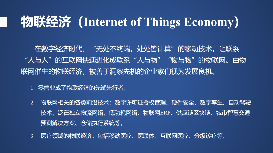 下面还有两个,一个是物联经济。万物互联,口号是挺好听的,“无处不终端,处处皆计算”,我们慢慢形成人与物、物与物的物联网,物联网这个口号到现在提了将近15年了,2007年温家宝总理视察无锡提到这样的概念,到现在我们的物联网跟工业界连在一起的工业物联网还是刚刚起步,前面我们尝到物联网甜头的主要是零售,零售业发展以后,发现我们原有的IT技术不够了,我们需要一些新的技术支撑,它的安全、运维。我这里说数字许可证授权管理,我们的硬件安全、数字孪生、自动驾驶技术,这里面都是和人工智能有关的。