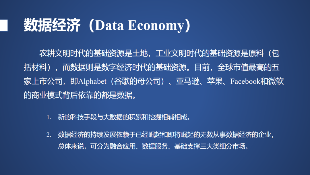第二数据经济的持续发展依赖于已经崛起和即将崛起的无数从事数据经济的企业,总体来说可以分为融合应用、数据服务、基础支撑三大类细分市场。上海的数据经济是走在全国前面的,尤其是这几年关于“十四五”规划里面,把数据经济放在很重要的地位,比如上海典型的“一网通办”就是全国领先的、用数据服务大家的例子。