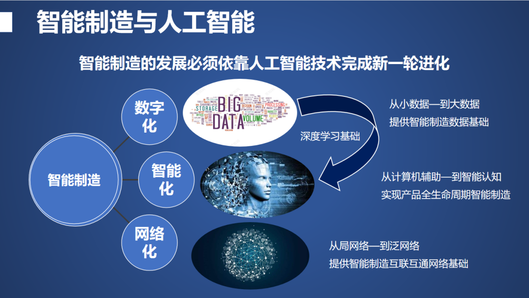 下面我们看一下,如果从智能制造出发,我们要经过哪几步跳跃?这里有三个跳跃要完成的,现在完成了第一步跳跃,从小数据发展大数据,为智能制造提供数据的基础,这是第一步,建库,把数据积累起来,这是数据财富。第二步我们刚刚开始做,我们要从计算机辅助系统,过渡到智能认知,能够逐步实现产品全生命周期的智能制造,这就难的多了。计算机辅助三十年前就有了,现在有什么变化呢?我们希望现在有智能认知的过程,现在很多产品跟要求距离还是很大的。最后我们希望从局网到泛网,提供智能制造互联互通的网络基础。这个阶段很明显,我们一般的单位现在可能连数字化第一步还没做,所以人工智能方面的专家,任重道远,要逐步推动各企业升级换代。