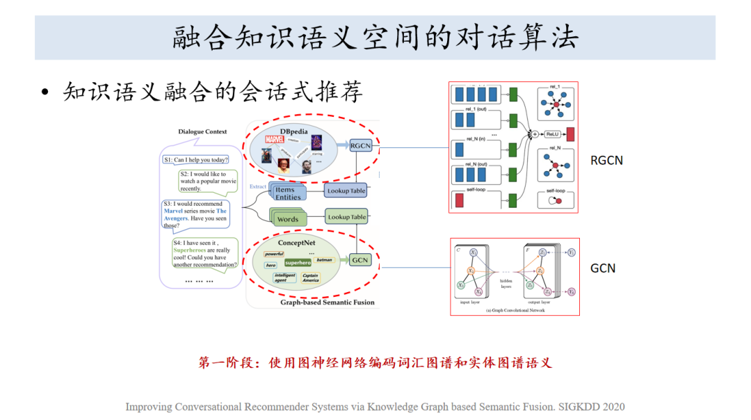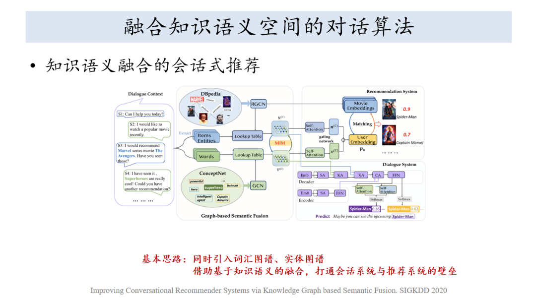 先看一下我们针对电影、导演、实体方面引入了知识图谱,这里面用的是DBpedia,土布是用的ConceptNet,上面都是图神经网络做编码,图的语义就被编码出来了,现在上下空间不相符,一个形容性的词怎么跟实体之间有关联,我必须打通这个关联。我们就用了一个信息最大化的技术,核心想法就是两个有关联的变量,使得关联靠近,对于我们发现一个词和实体经常有贡献的话,表示拉近,这样就可以打通上下的词汇空间和文本语义的空间。