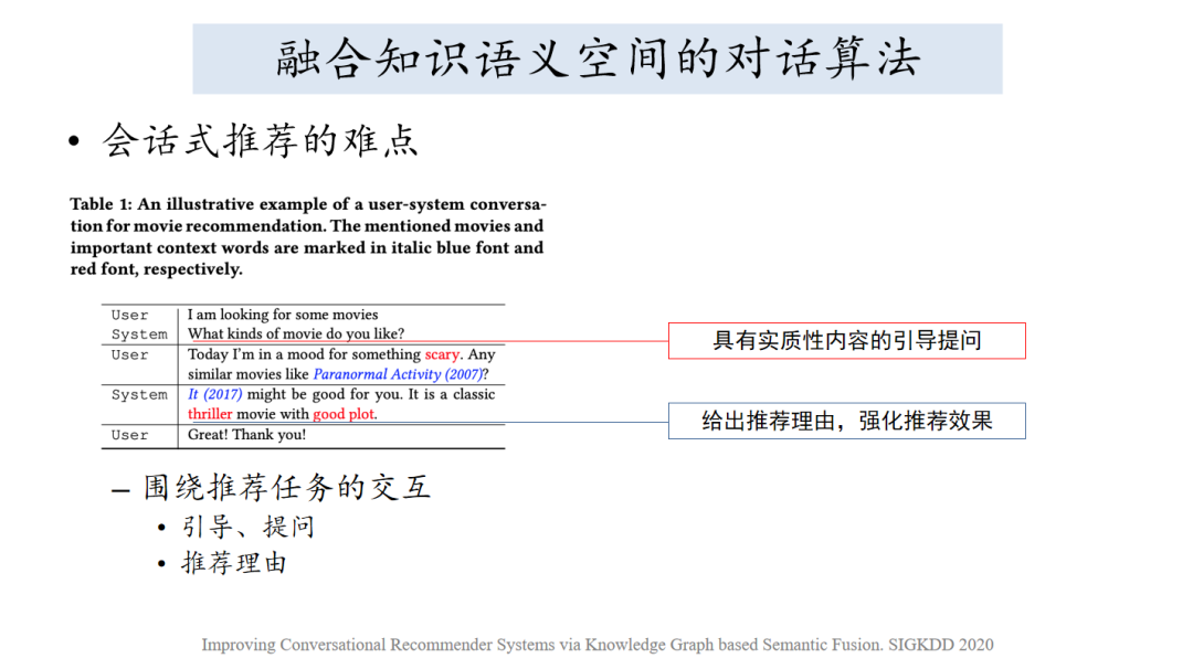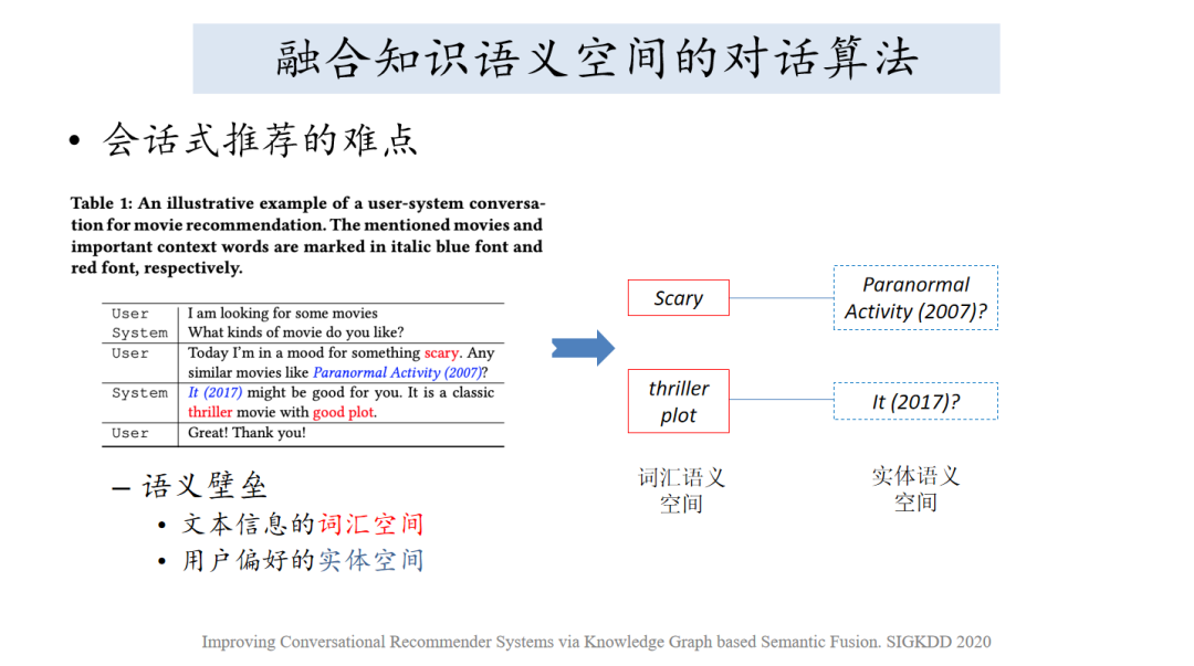 第一是算法,我们看一下这样的事情是比较难的事情,这边我们列了一个简短的用户找电影的过程,用户想找到一些恐怖电影,他说有没有电影和这个是相似的。就说IT片子是也许符合你的,也是经典的恐怖电影。这个过程完全都是通过文本或者对话的方式表述的,如果文本字面很难说恐怖电影和这个电影名字有关联,这个是《IT》词如何知道是一个电影,我们必须要引入外部知识。引入外部知识之后发现什么呢?实际上存在两个语义空间,第一是词的语义空间,另外一部分就是实体的语义空间,怎么知道IT和剧情包括恐怖电影之间有联系的,这一部分是词的语义空间,一部分是实体的语义空间,实际上就是语义壁垒,如何把这个事情打通。
