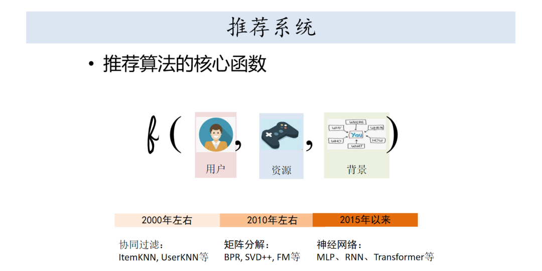 推荐算法的论文有很多,上千篇是有了,核心就是设置一个函数,就是F是一个函数,最终就是计算用户资源在某一个背景下,这三者的匹配程度,你推荐的情况下就是给特定的背景,针对用户推荐合适的资源,大概技术的进展就是2000年主要协同过滤,2010年是基于矩阵分解的,2015年左右开始神经网络的算法基本上算是主导了这样的推荐系统主要的架构,现在工业界很多都是神经网络为基础设计自己的框架。