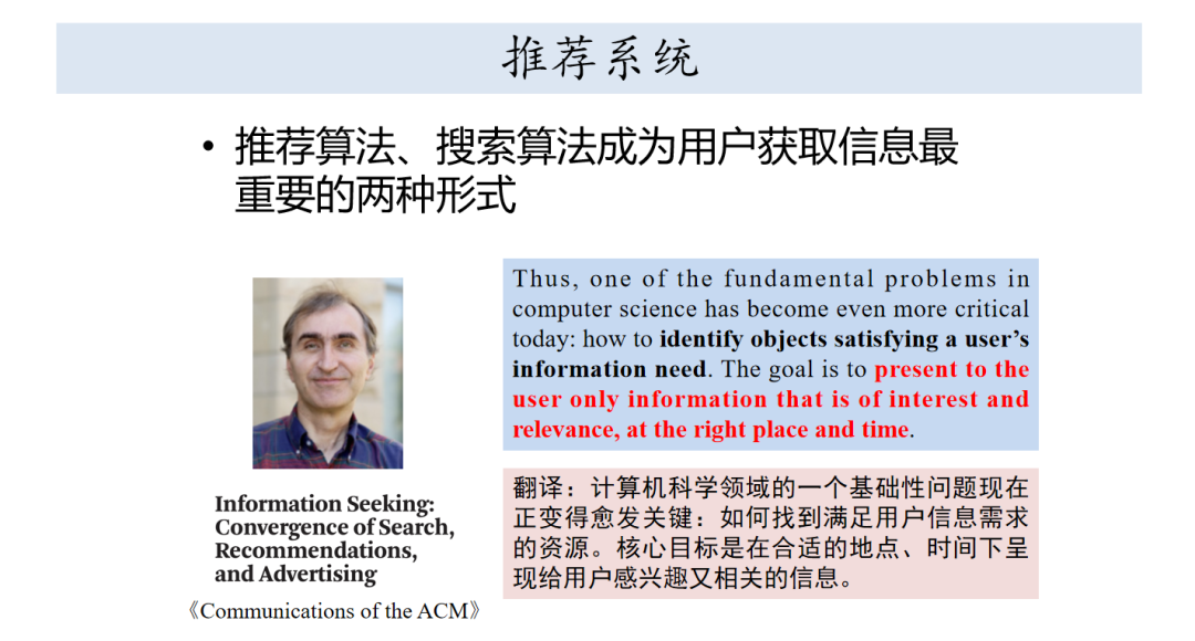 这一页PPT是比较有意思的论文,主要是讲信息时代用户获取信息的几种重要的途径,认为推荐算法和搜索算法成为用户获取信息的最重要的两种形式,最后推荐搜索和广告会达到收敛,最终是为了满足用户需求的事情。