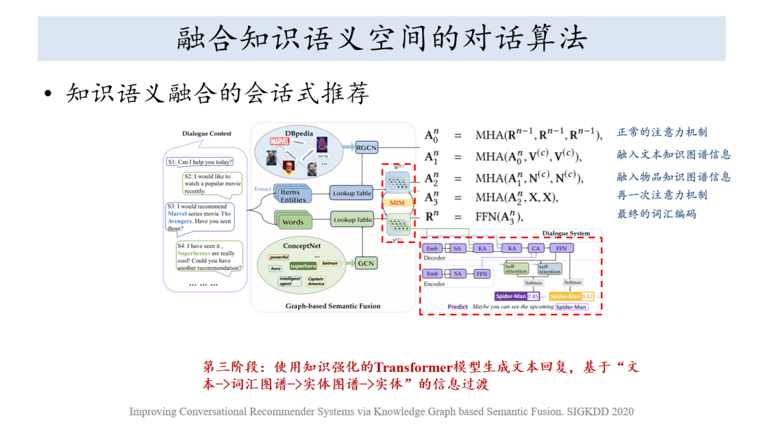 比较复杂的就是最后怎么生成富有信息量推荐理由,为什么给你推这个电影,这里面就不是闲聊了,同时成为一句话,包含电影,包含人物,把原来比较经典的transformer做了拓展,把词汇图谱和实体图谱融入这个过程,使得我们生成带有实体、带有推荐理由的回复。
