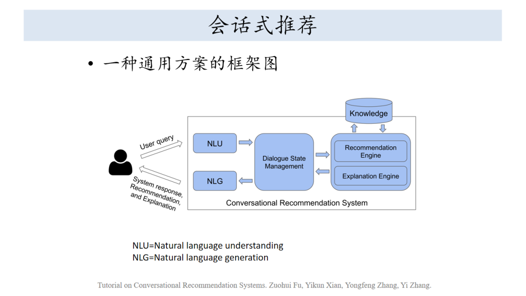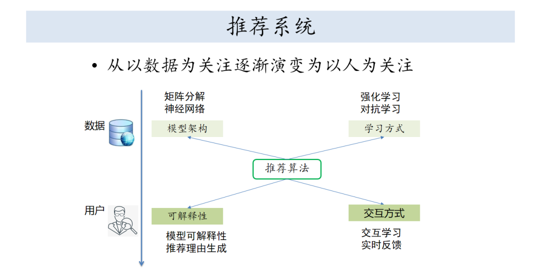 早期的侧重点是数据,刚才也看到那个函数,怎么把数据里面的函数学习出来,更关注于模型的架构和方式,现在学习算法有很多种了,对于这样一个偏应用的题目,可能用户就会变得尤为重要,就是如何吸引用户,让用户多找到符合自己兴趣的信息资源,更为观众可解释性和交互方式,可解释性是模型具有可解释性,另外就是给用户是劝说性的,为什么用这样的推荐。交互方式就是希望这个模型上用户进入,让用户提供反馈,而不是单一的反馈,最后算出一个比较冰冷的值,而是希望用户进入到函数中间。在这种背景下,会出现会话式推荐。