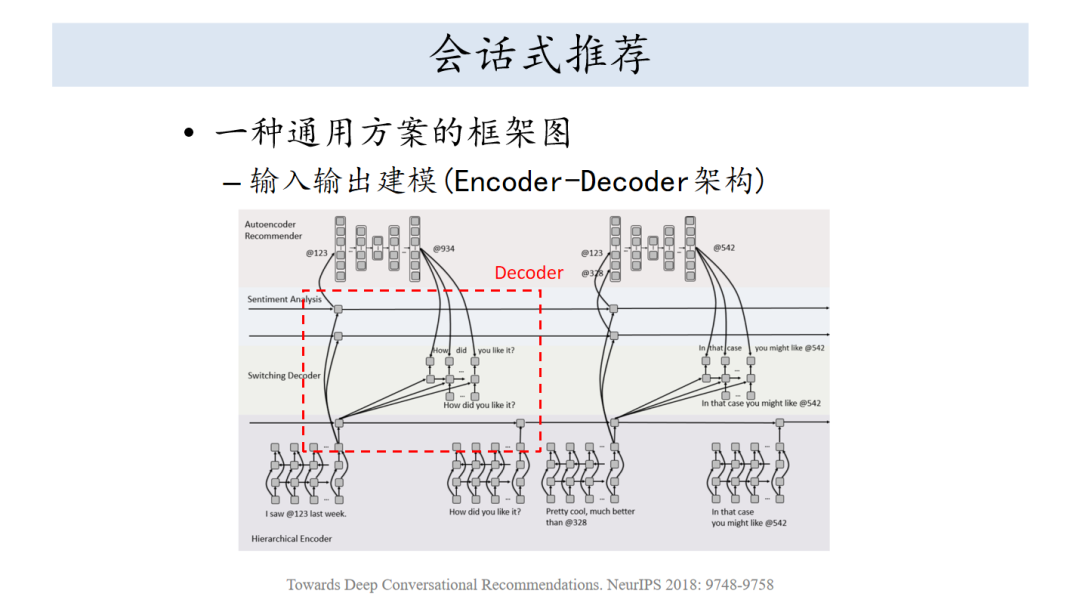 真正重要的进展是2018年左右,第一篇论文是定义清楚了深度学习情况下会话式推荐系统的框架,后面就是进一步把对话进行完善。第三篇论文是把知识图谱引进来了。