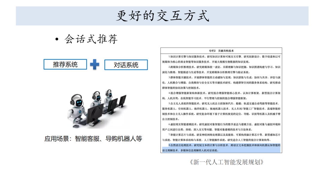 会话式推荐是什么呢?大家用过智能客服和导购机器人就知道是什么场景了,比较典型的例子就是智能客服和导购机器人,这个是和智能系统相关联的,我国也在《新一代人工智能发展规划》里面也说列为重要的发展方向。
