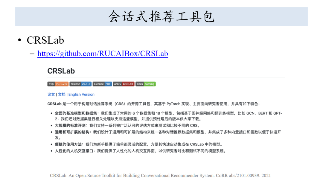 我先介绍一下推荐算法工作内在的原理和工作进展,姐姐这介绍一下会话式推荐题目下有哪些进展,最后是我们研究组的工作,涉及到算法、数据集和工具包。