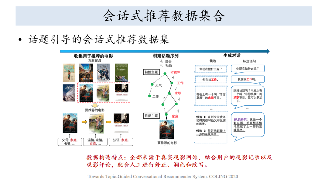 我们也是发布了数据集,大概有一万个对话,里面包含12个句子,要不然是提问,要不然是回复,也是围绕这个定义了三个任务,物体的推荐、话题的预测和回复的生成。