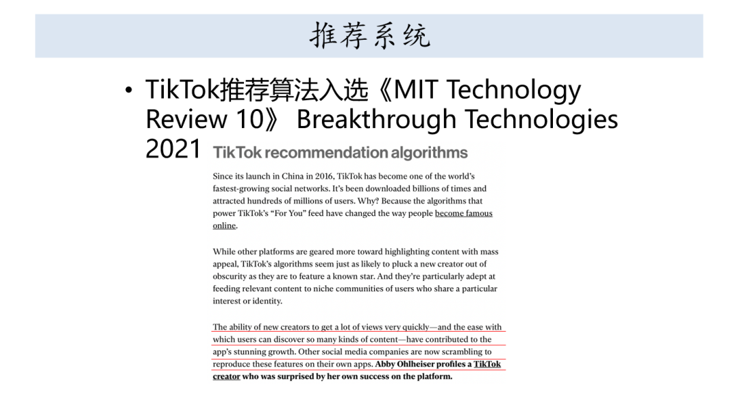 今年MIT技术评审也把推荐算法列为2021年十大突破性技术,可以快速的吸引到很多的观众,并且新来用户的资源可以非常快速的获取到很多的关注。