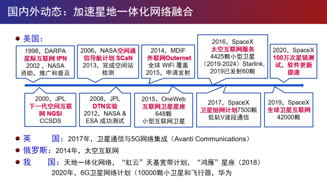 目前在星地一体化融合方面,国际普遍共识,并且加速推进的,尤其是以美国为代表,2016年提出来由4000多颗星、7000多颗星,甚至2019年42000颗的全球卫星互联网计划,包括英国俄罗斯在相应的领域都做了部署,我国也是对天地一体化网络进行了虹云、鸿雁的规划。华为提出了1万颗小卫星飞行器的计划。