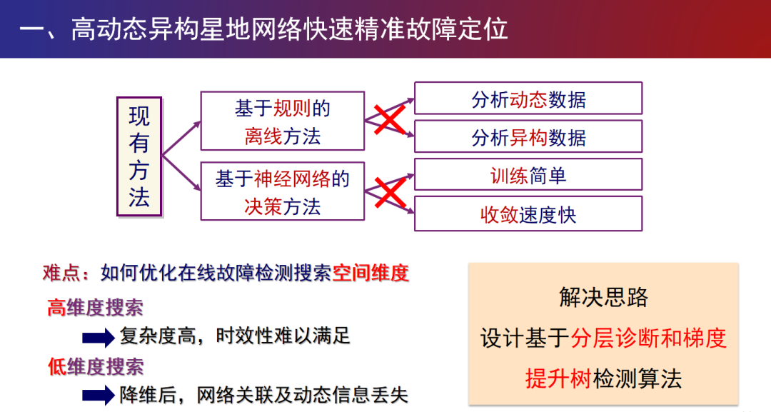 首先是故障定位,故障定位张萌老师也介绍了攻击和网络直接的损毁造成的故障,传统有规则的离线方法,但是对于动态、异构来说,传统的方法很难满足需求。我们就提出来进行在线的检测故障搜索方法,难点在于什么呢?如果用高纬度搜索,这个业务也很多,问题出现的会非常多的情况下,高复杂度的搜索,时效性难以满足。低维度的搜索,把维度降低,用处理的方法,但是会导致网络中的耦合关联和动态信息丢失。