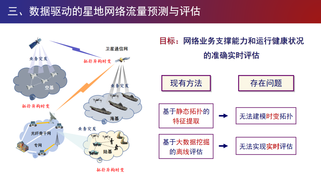 天上的飞机和陆地上的通信称它为子网,实现这种综合网络的管理,难点在于这个网络异构性、高动态性和业务的突发性,这个业务拓扑高动态、网络异构显著,卫星链路出现问题,在完成整个联合任务的时候,在地面、海上甚至无人飞机上面的通信同时都会来报警。这样一个网络规模下大家都在报警,故障的根源在真正地方,这个在数据非常海量,网络规模庞大的情况下很难发现,我们称之为看不清的问题。