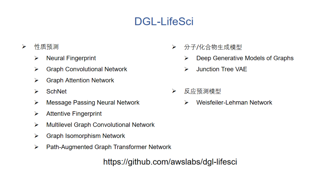 基于DGL我们也做了一些小分子上面常用模块的支持。这里有一个DGL-Life Sci,它是对性质预测、分子生成、反应预测的模型有些内置的支持。我们想的一个事情是,有些用户可能想试一试,但又不愿意花很大时间精力去学习,比如说机器学习、编程或者图神经网络,那我们可以提供比较好的界面,可以让用户直接处理好某种格式的数据,他就可以直接调用这些命令行去做训练和建模。