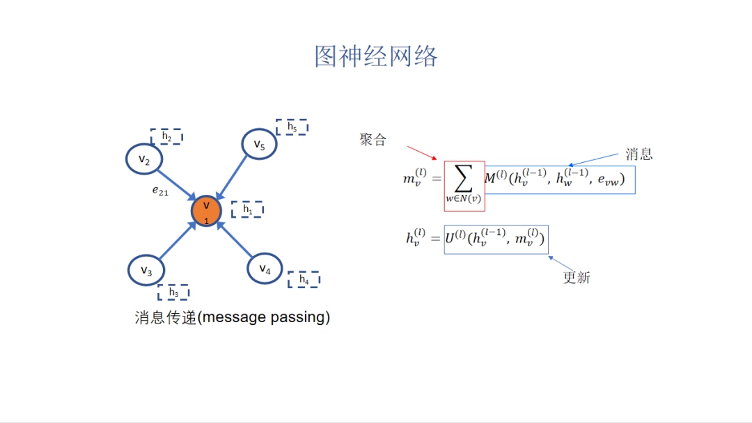 最近几年非常流行的一种图机器学习方法就是图神经网络,图神经网络核心想法是比起之前网络嵌入只能够捕捉在网络结构上节点的相似度,我们还希望同时捕捉在语义上的相似度,核心思想就是消息传递。为了更新一个节点目前的表示,我们首先从节点相邻的所有邻居节点那边收取一个信息。就是这样一个消息函数,这个消息函数可以是某种可以学习的神经网络,输入是我想要更新的节点表示、边表示和邻居节点表示。当我得到所有邻居节点消息以后,我需要对这些消息进行聚合。一般来说希望图上这样一个聚合操作和结点编号是无关的。比如所有消息拼接起来的话,这个拼接顺序跟节点顺序有关,我们希望做一些顺序无关的效果,所以我们常见是做一个求和的操作。