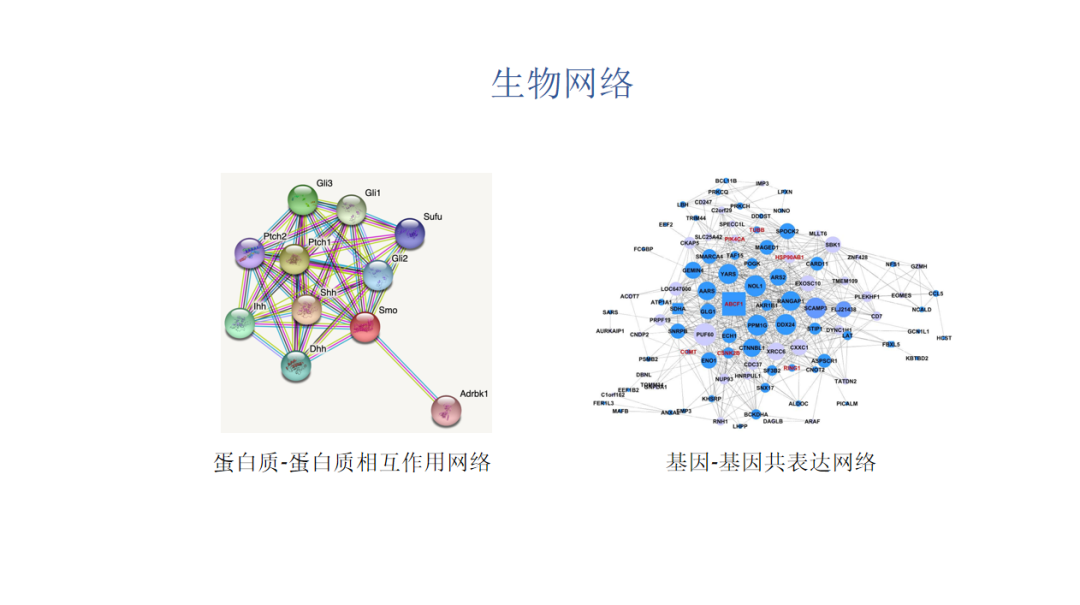第三类是生物网络,比如说蛋白质-蛋白质相互作用网络,每个节点表示一个蛋白质,边表示一对蛋白质间存在某种相互作用。又比如基因-基因共表达网络。