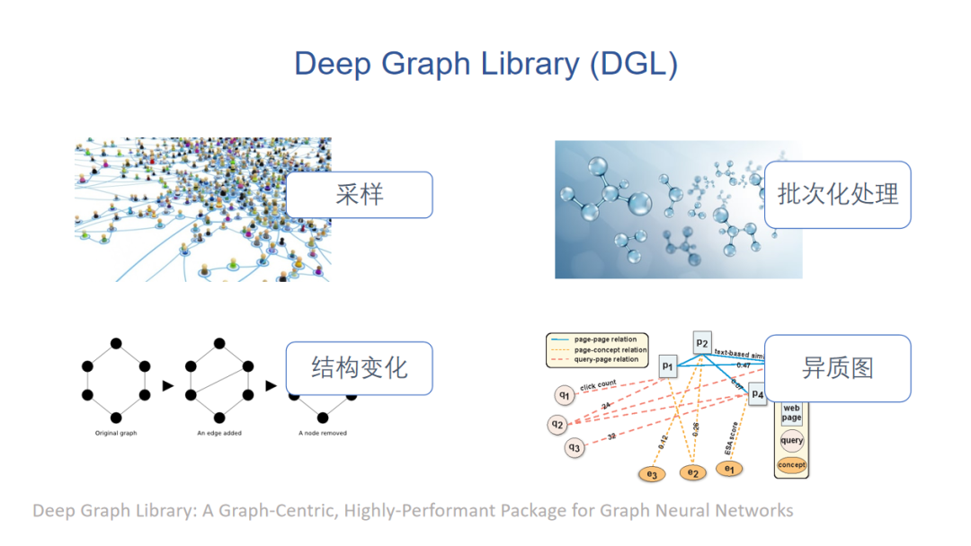 首先我们组做了一个Deep Graph Library(DGL),比如说如果训练一个很大的图,这个图可能没有办法放到GPU机器,这样可以做图采样或者图划分的操作;或者有小分子图的时候,不同小分子图节点数量和边的数量是不一样的,可以做补零操作,加空的节点和边,另一个可能性是拼凑一个很大的图,小图都是这个大图里面的连通块,这里有批次化处理的支持。同时针对生成式模型我们还支持结构变化。对于异构图,我们支持显式的节点类型和边类型。