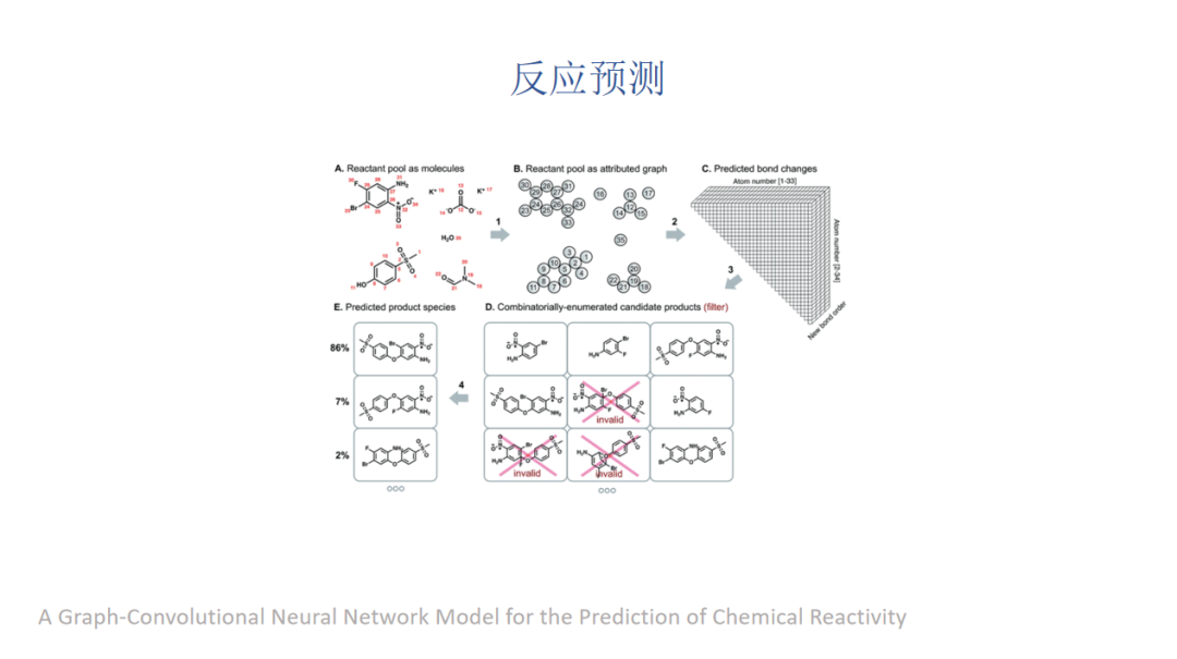 另外一个任务是反应预测,就是我有一些反应物然后我要预测它的产物是什么。这篇工作他们也是用图来表示反应物,反应预测分两步,第一步是预测哪些原子对可能有一个成键或者破键的变化。它可能本来是相连的原子对,但是它失了这个化学键;或者说它要去形成一个新的单键/双键/三键或者芳香键。当我们得到可能成键或者破键的原子对以后,我们可以把其中分数比较高的去做枚举得到可能的产物,然后再训第二个模型对它们进行打分。