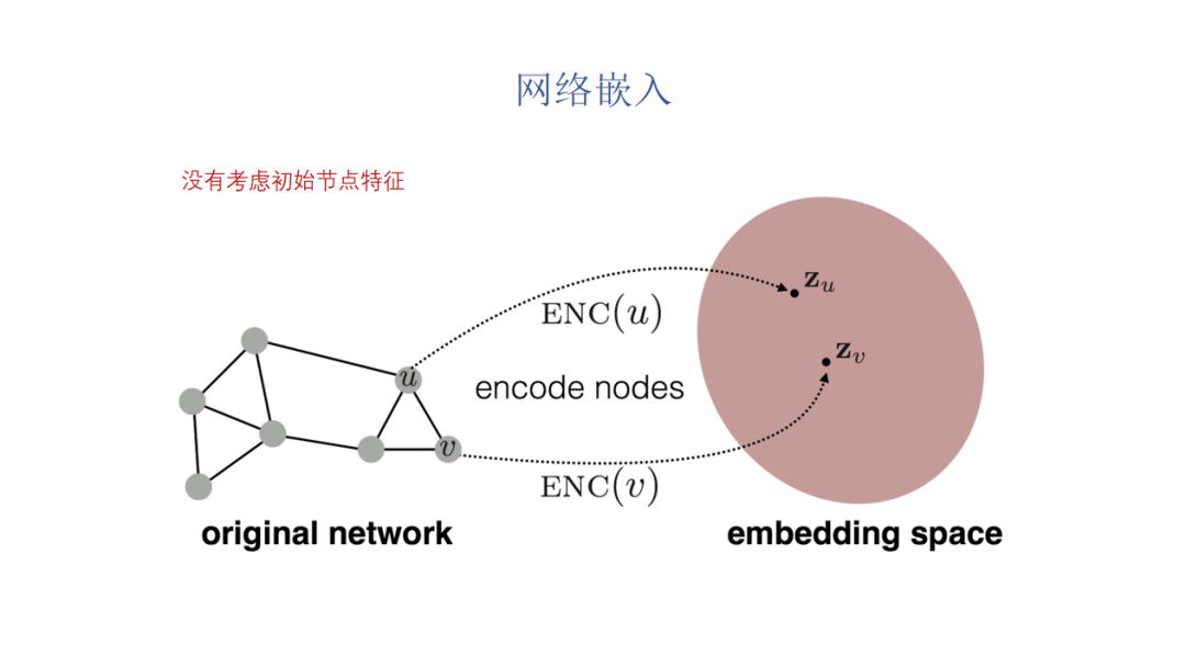 图机器学习的核心想法其实是学习高质量的节点嵌入,怎么理解这个节点嵌入呢,我们用一个向量表示一个节点,比如说我们可能希望图上距离接近的节点之间向量在某些距离函数情况下也是接近的,比如说希望节点对之间內积是比较接近的,或者我们可能会希望这个节点嵌入可以包含节点的语义信息。