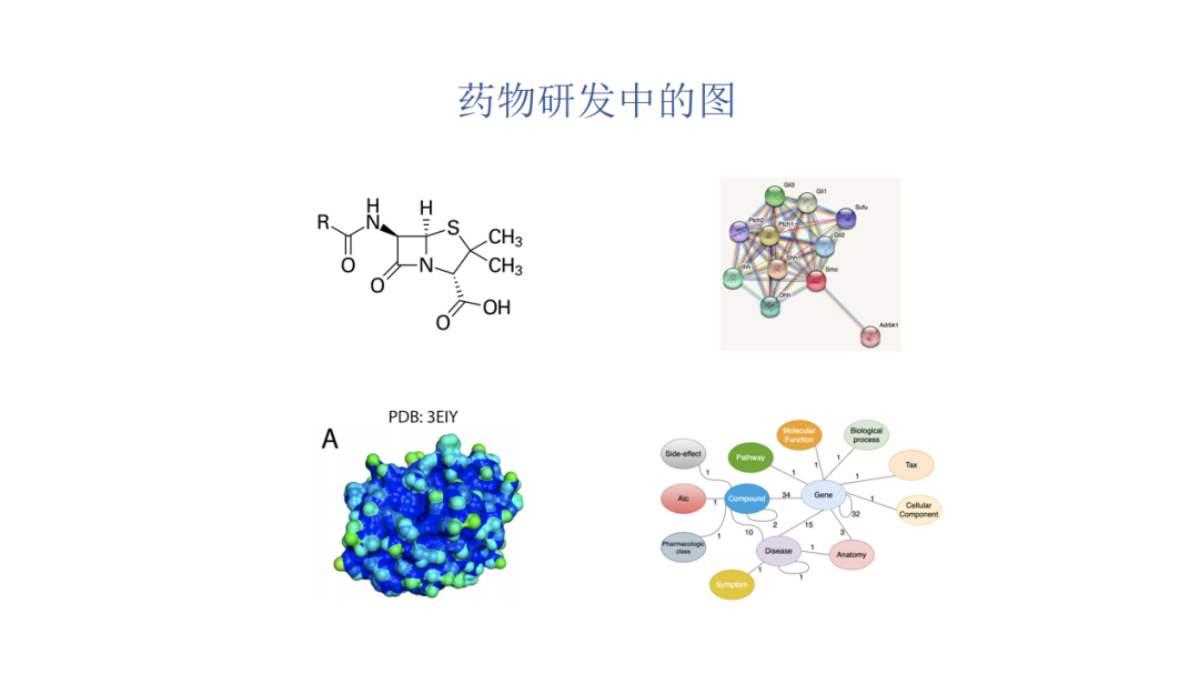 我们发现药物研发中的很多数据可以用图来表示,比如小分子、蛋白质、生物网络、知识图谱。