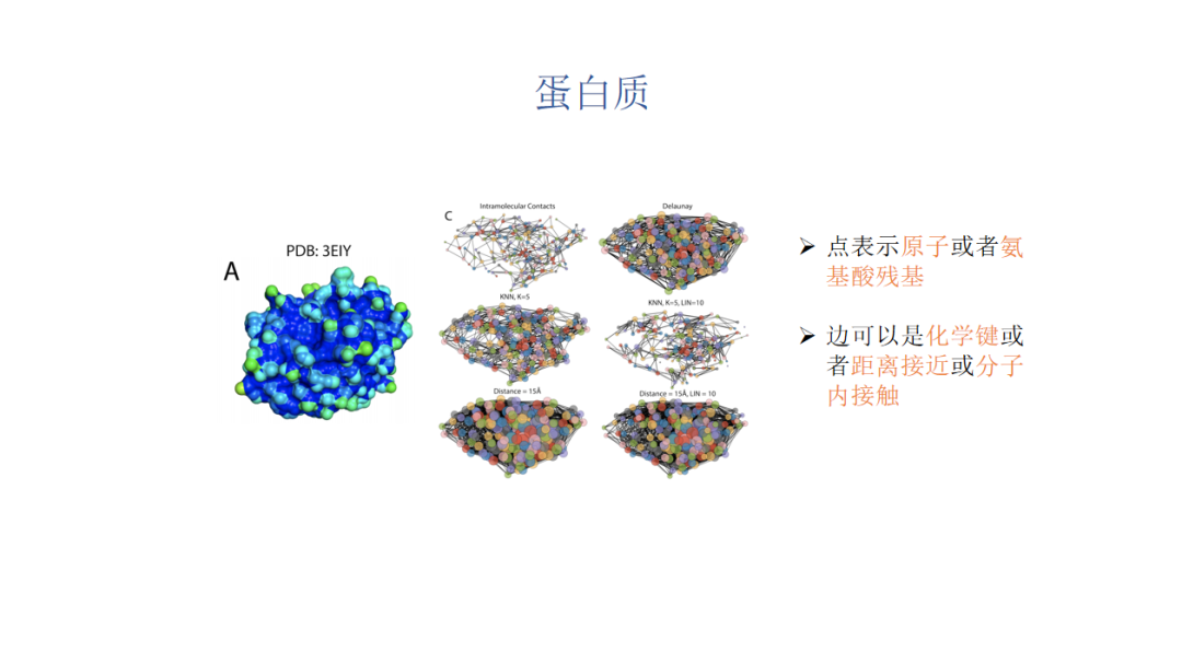 我们也可以用图来对蛋白质建模,这个图是剑桥一个博士做的工作,就是如何对蛋白质构建各种图。点可以是蛋白质里面的原子或者氨基酸,边可以是化学键或者距离接近或者分子内接触。