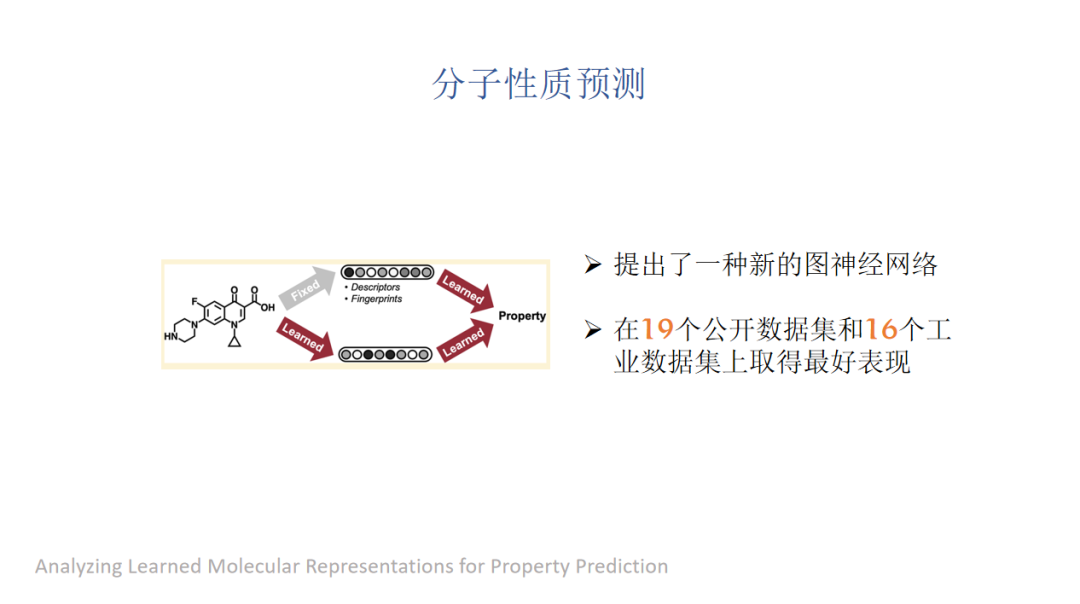 在这篇工作里作者们提出一个新的图神经网络和传统的分子特征去做比较,他们在19个公开数据集和16个工业数据集上都取得了最好的表现。