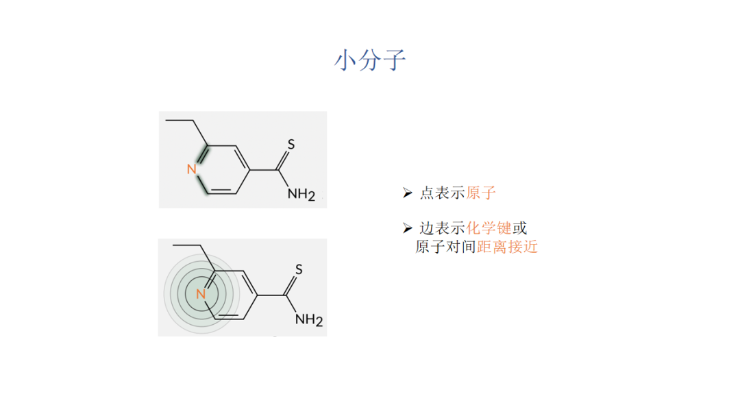 首先小分子的建图是相对比较直观的,一般都会用分子图,其中节点就是分子里的原子,边可以表示化学键或原子对间距离接近。