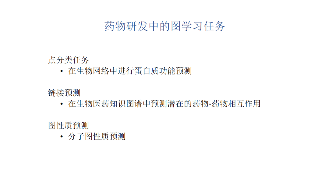 药物研发中的图学习任务,比如说点分类任务,在生物网络中进行蛋白质功能预测。链接预测,在生物医药知识图谱中预测潜在的药物-药物相互作用。