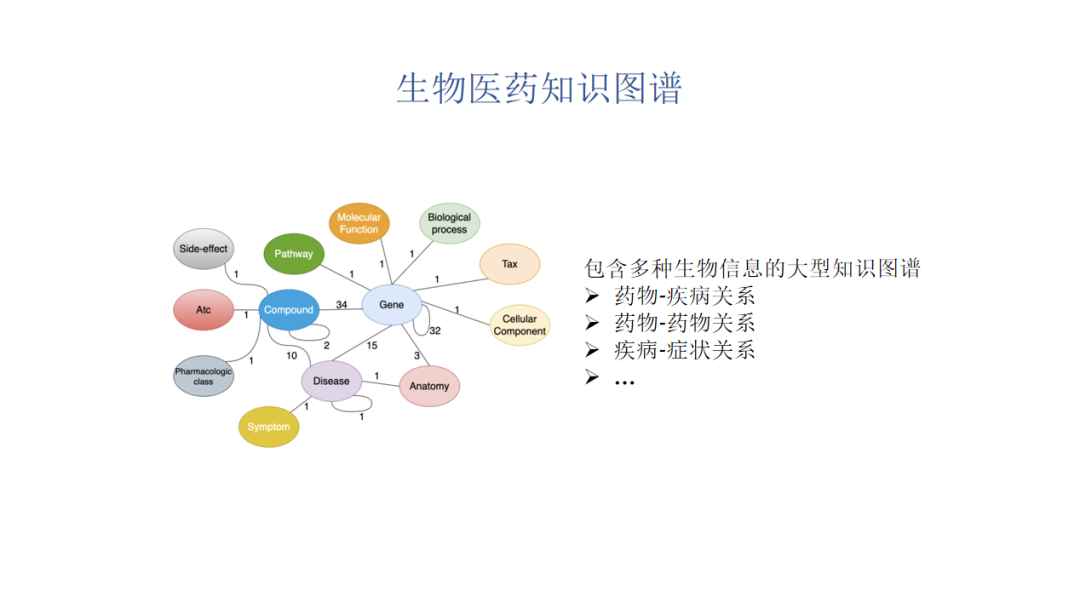 我们可以进一步把生物网络做一个拓展,主要是加入一些临床相关的信息就可以得到一个生物医药知识图谱,可以表示丰富的知识信息,比如药物-疾病关系、药物-药物关系、疾病-症状关系。最早魏老师提到DDI,也可以用知识图谱来表示。