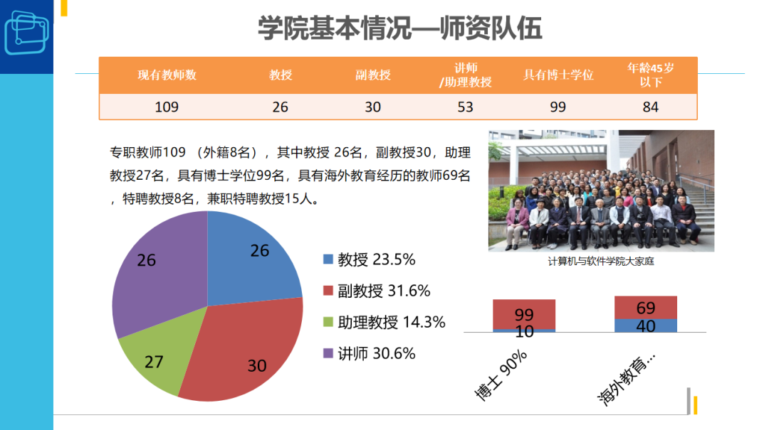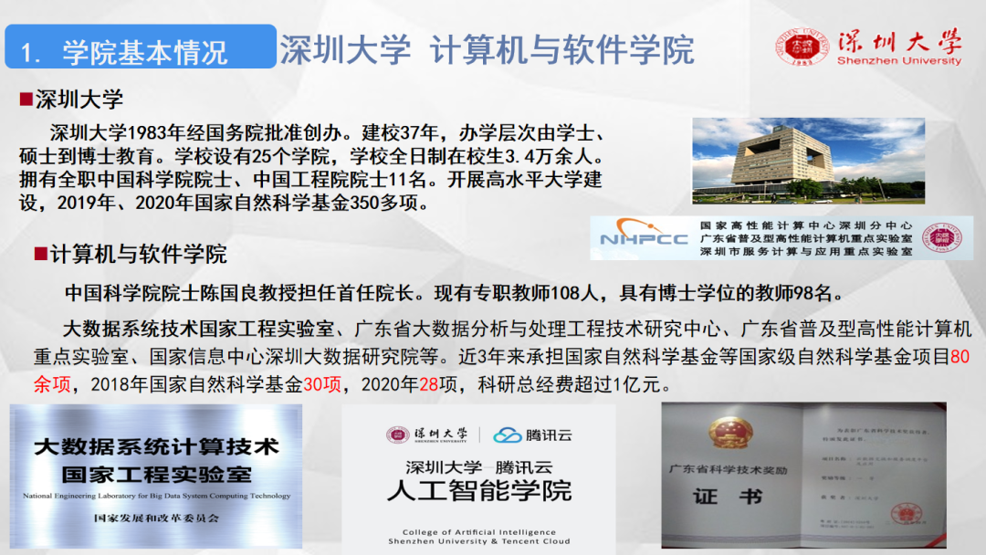 刚才介绍了我们有100多位老师,60-70%都具有海外经历,基本都有博士学位。这是我们的科研平台,一个国家级大数据工程实验室及十几个省级实验室,这里不多展开。我觉得对深圳大学、教学科研来说,非常重要的一点是依托了深圳的地理位置,深圳大学在南山区,围绕我们周围的是科技园,在科技园里面就有超过160家上市公司,这个在全世界来说都是非常集中的。比如腾讯大厦、滨海大厦、阿里巴巴大厦等等,这是我们周边的整个环境氛围。