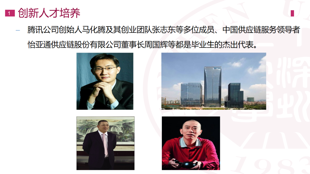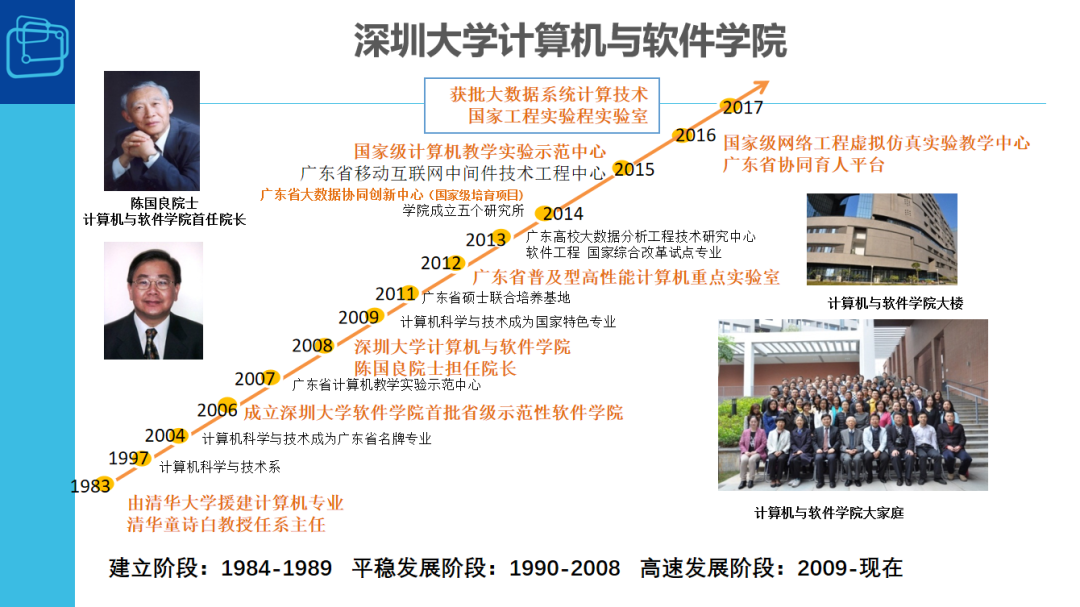 因为我们地处深圳,深圳还有一个点比较好,周围的产业环境比较不错。这里我们还跟腾讯成立了人工智能学院。腾讯的创始人团队有五个人,四个毕业于深圳大学,所以我们跟他专门成立了人工智能学院。我们也在不断努力的探索过程中,这是我们学校学院的介绍,因为我在学院里面分管教学,所以这是一个宣传的PPT,目前我们学院有两位院士。在前期发展过程中还是稳步发展,最近一些年得到了比较快速的发展。比如我们教学方面有两个国家级平台,科研方面有一个国家级平台。这里是几个代表性校友,比如马化腾、周国辉。