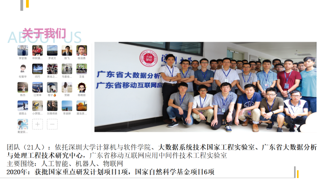 首先介绍一下我们团队的情况。我来自深圳大学,它的地理位置比较南,去哪里都要做飞机。深圳大学是相对比较年轻的学校,1983年建校,今年快38周年了,近年来也在不断的做高水平探索,目前学校里面拥有两院院士14名,在各项指标上也在努力。因为深圳大学是一个市属高校,所以我们的各项指标只能不断的努力。比如我们2019和2020年的国家基金,在2020年我们有370多项,对于深圳大学来说已经非常不容易了。