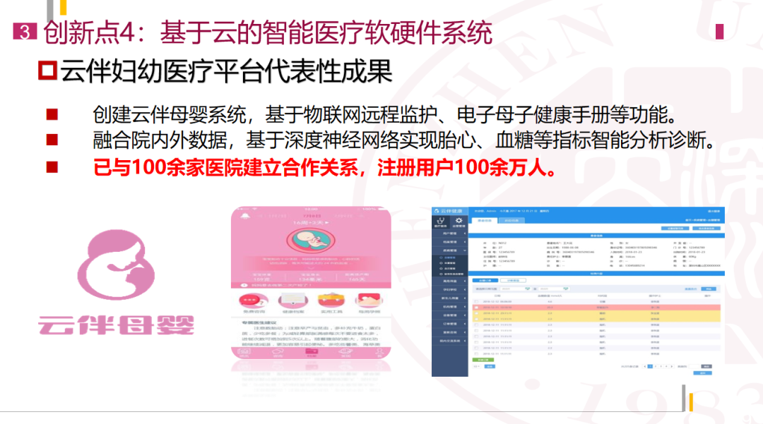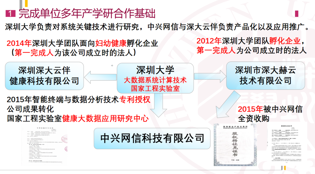 前期我们得到了各类项目,这一块从2008年到最近一直在做的工作,一个是有各类项目的支持,其次我们自己也孵化了两家企业在做成果转化,这时间年来一直在做这部分的探索。这个是我们在前面做的工作,深圳大学一个是国家工程实验室,一个是孵化两家企业,一家是给中兴全资并购,那是针对慢病板块的。这是我们自己在孵化的,专门针对妇幼板块的工作。因为这里的氛围比较好,成功转化体系也好,它在2015年就被收购了。当时我们发现妇幼方面通过信息化手段还是非常有价值的,后面就孵化了妇幼板块,这个也是2014年孵化的。后面在社会上,在医院各个方面也真正的用了起来。
