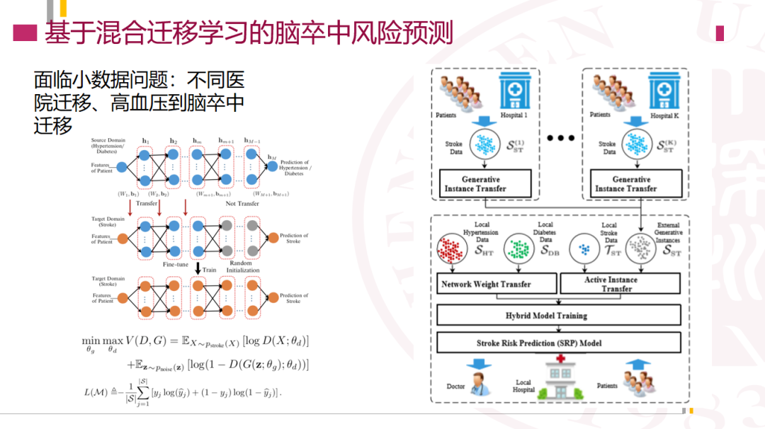 后面我们再做一个数据分析,因为后面很多数据分析,所以过一下我们做的情况。我们讲是把这些用起来,但数据分析用起来是分析最重要。在医疗大数据里面会面临什么?数据很多,同时面临小数据。比如用的过程中,在分析的过程中发现脑卒的数据非常少,但中风是非常需要关注的。有一类数据非常多:高血压,现在我们就把高血压迁移到脑卒中里面,我们通过深度学习有效提高准确率,这个在深圳南山医院后面取得了非常好的效果。