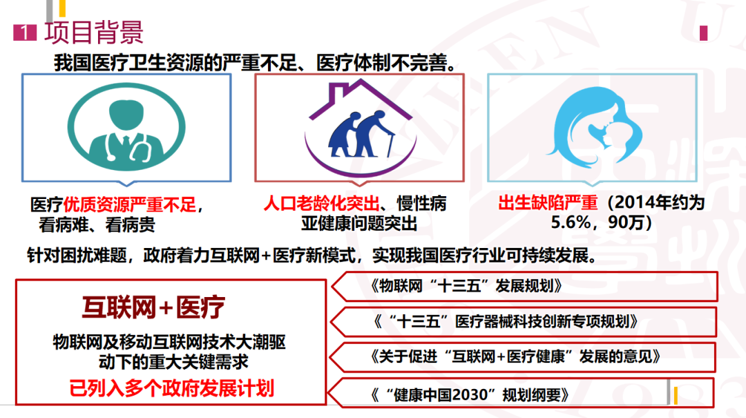 1.出问题的时候不在医院,无论是慢病,还是妇幼领域,在医院里面有各种各样的大设备,所以我们第一个想做的就是通过穿戴式设备,这里能不能做一些工作随时监测?刚才主持人提到的超声,超声我们也做了一些,但今天我没有细讲。因为医院各个科室都想做工作,我们超声做的是机器人,现在因为有职业病,用机器人就可以把超声的检测做完。