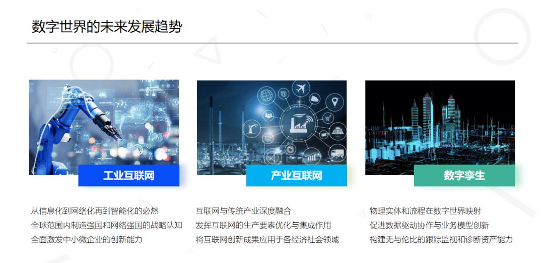 进入今天的正题,我们先来捋一捋几个概念。我之前在腾讯的时候,包括Pony马化腾在内,一直在讲消费互联网的红利已经结束,下20年主战场在产业互联网。我们也看到各种行业分析报告里都在提数字孪生,工业互联网,工业4.0等等各种新的理念。这代表什么意义呢?在我看来这是传统企业信息化、网络化、智能化必然趋势。