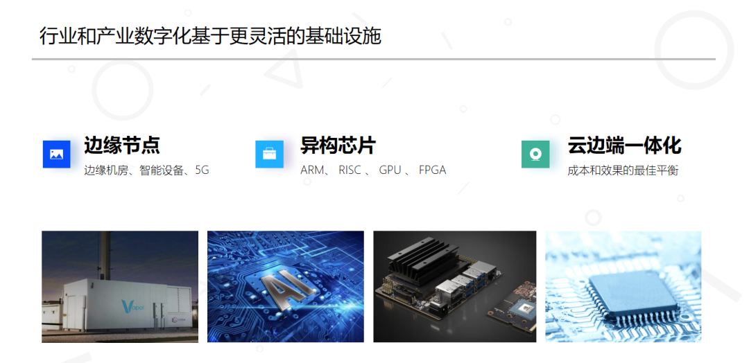 第三、云边端一体化。这些年很多厂商已经提出了云边端一体化的概念。边缘计算、异构芯片、5G的发展,使得算力资源,数据存储分布在从端到云这个链路各个节点上。云边端一体化的调度和管理,才能够充分的利用这些资源,为同样分布在这些节点上的软件应用服务。