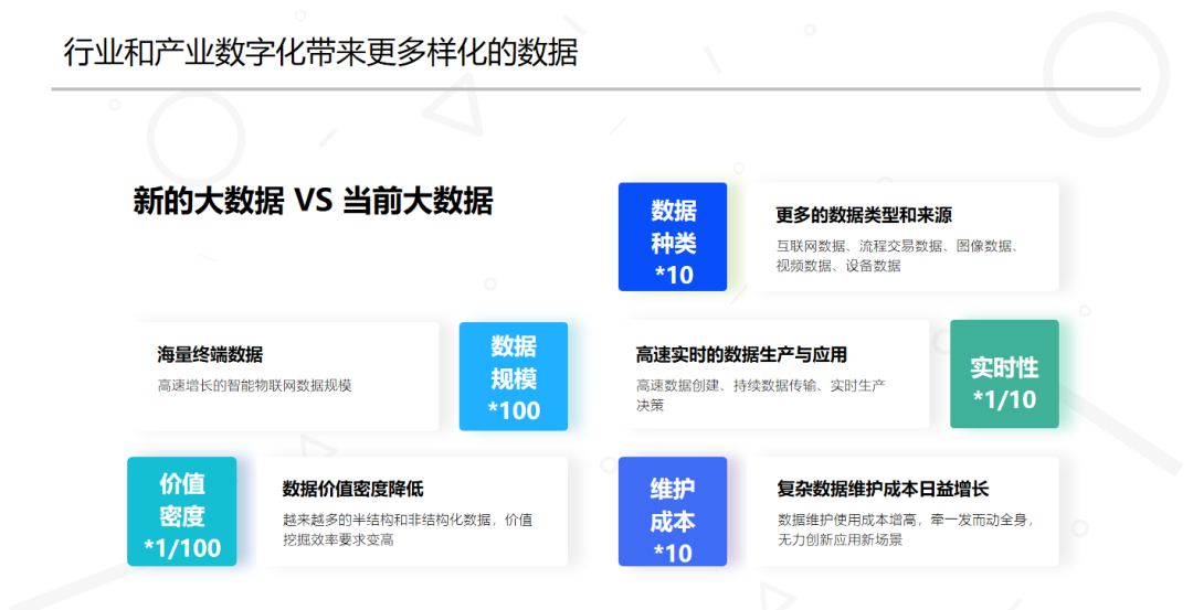 这里有个非精确量化的总结。和传统的互联网大数据相比,一个典型工业大数据平台支撑的数据类型都是超过10倍,数据规模也是传统互联网的100倍。如果考虑到智能制造和工业互联网的高速发展,这个数据规模将会是几何级数的增长。