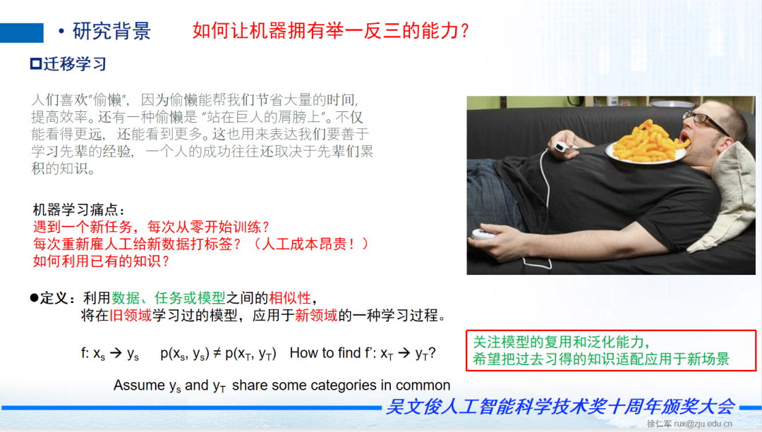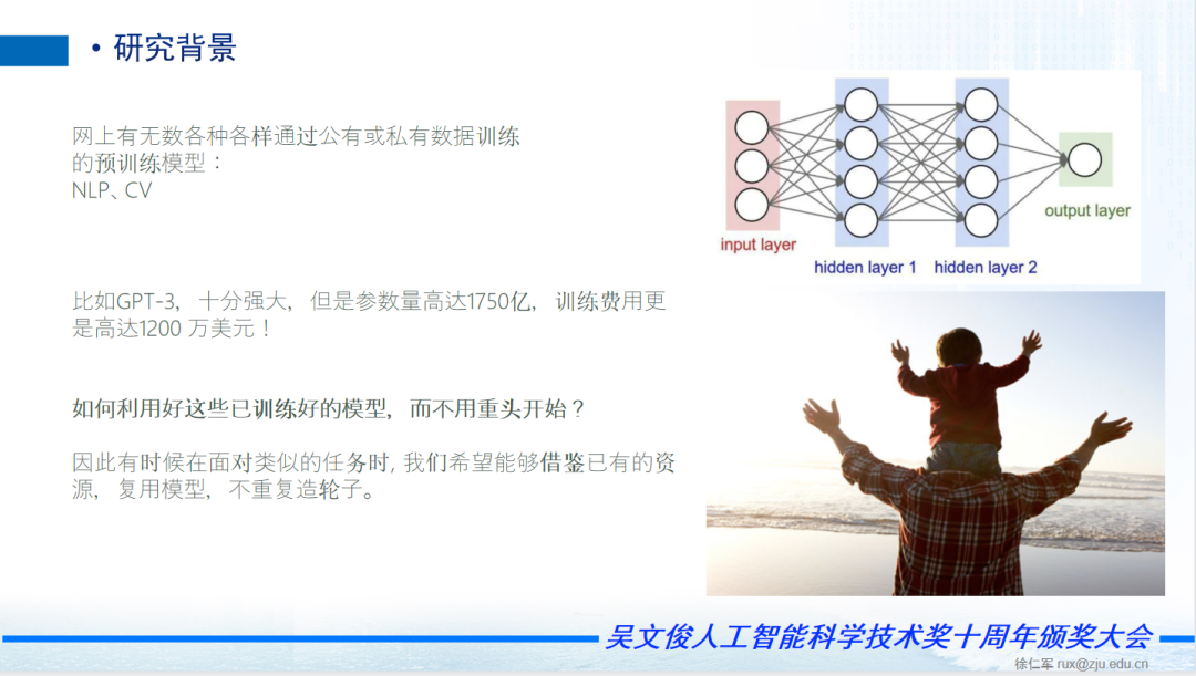 另外我们主要关注模型的复用和泛化能力,希望把过去习得的知识适配应用于新场景。现在我们对人工智能有很多关注,也得到很多模型,现在网上有无数各种各样通过公有或私有数据训练的预训练模型:NLP、CV,比如GPT-3,十分强大,但是参数量高达1750亿,训练费用更是高达1200 万美元!如何利用好这些已训练好的模型,而不用重头开始?因此有时候在面对类似的任务时, 我们希望能够借鉴已有的资源,复用模型,不重复造轮子。比如说百度模仿谷歌,模仿facebook,模仿KFC。