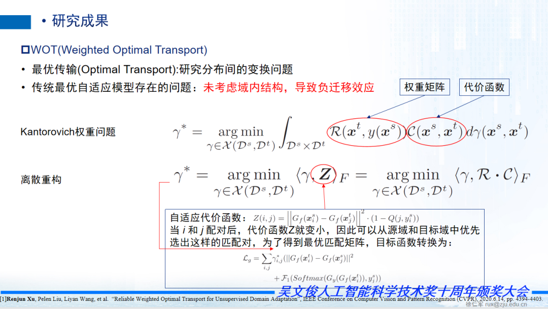 这里是最优传输(Optimal Transport),数学表示是这样的,γ*,这里Ds表示原域,Dp表示目标域,γ表示它的配对,比如说原域跟目标域怎么配对。这边大R是一个权重的矩阵,大C是代价函数,上面是连续的积分,我们需要离散化,Z(i,j)我们是这么定义,原域里面的表征跟目标域表征的距离乘以Q,根据这个加权权重定这个Z,当 i 和 j 配对后,代价函数Z就变小,因此可以从源域和目标域中优先选出这样的匹配对。