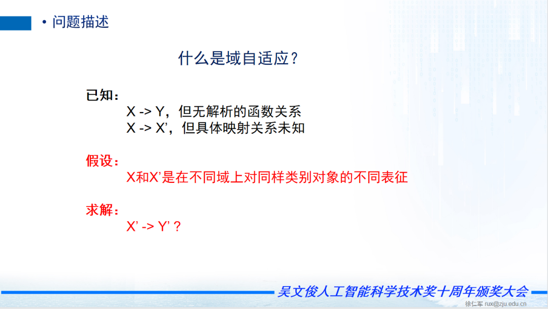 XY是已知的是原域,Y就是标签,但是XY没有一个解释的函数关系,是基于数据驱动的。另外,比如说一个真实的猫跟卡通猫都是猫,但有一个映射关系,这个映射关系我们是不知道的,真实照片的猫跟卡通的猫,我们知道困难存在一种关系,但是具体什么关系我们不知道,这是我们的假设,已知两个条件加上一个假设,X跟X'是不同域上对同样类别对象的不同表征,一个是真实照片的猫,一个是艺术卡通画的猫,是猫这个对象不同的表征。现在我们的目标是求解,给卡通的猫以后,卡通的猫怎么把它正确的识别出来,怎么打上Y'的标签,这是我们要做得事情。