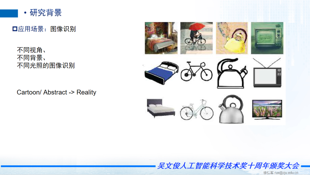 研究的背景,比如说小孩,他会看电视或者老师教他猫长什么样子的,狗是什么样子的,小孩子学了以后,他其实是能够正确了解真实场景中猫和狗的识别,但是在我们机器没有这样的智能,所以我们现在在做这样的事情。