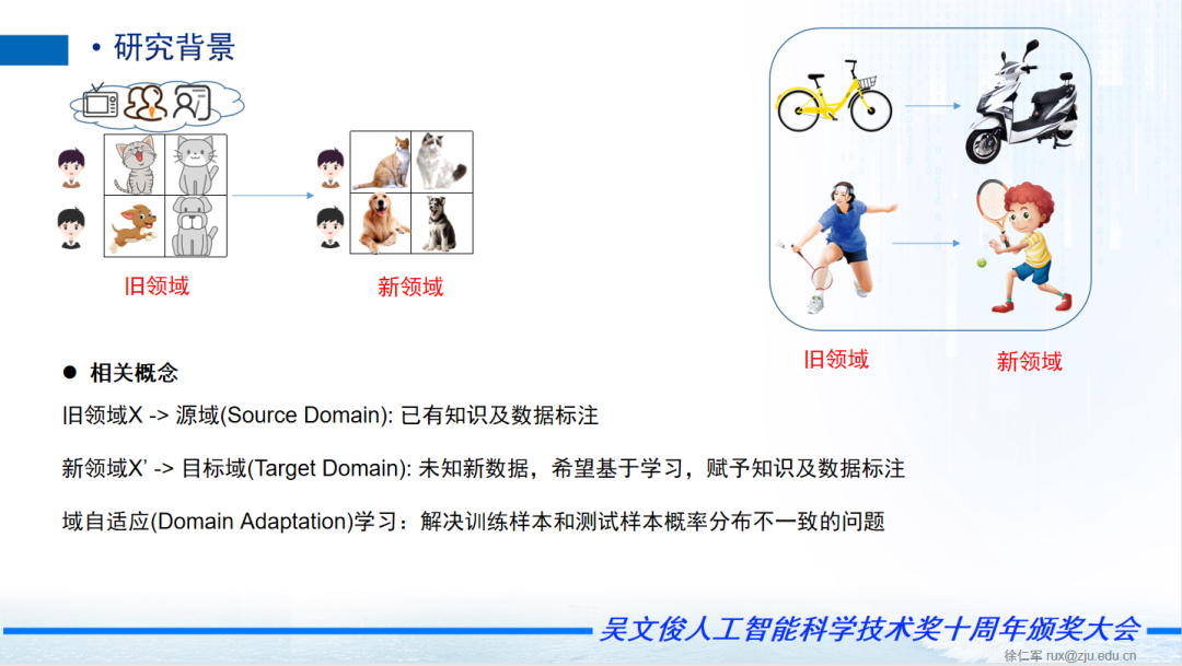 目标域是一个未知的新的数据,我们希望基于这个学习赋予新的目标与知识跟数据标注。域自适应是解决训练样本和测试样本概率分布不一致的问题,同时这两个数据存在一定的关系。这样对于新的目标域的数据也不用打标签,它可以大幅提升,现在打标签最大费时的是这个过程。
