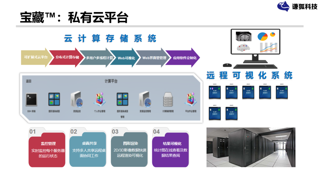 数据管理起来之后,是应用。计算的平台,这一块更多的做一些服务,以前大家都有服务器或者都有自己的笔记本做应用的分析,但是这个资源是非常有限的,我们相当于为每个单位建立自己私有的计算平台,然后我们会把相关的应用分析的工具在上面部署好,每个用户开一个账号,有自己独立的可分析的桌面,然后自定义的去定义分析的环境。