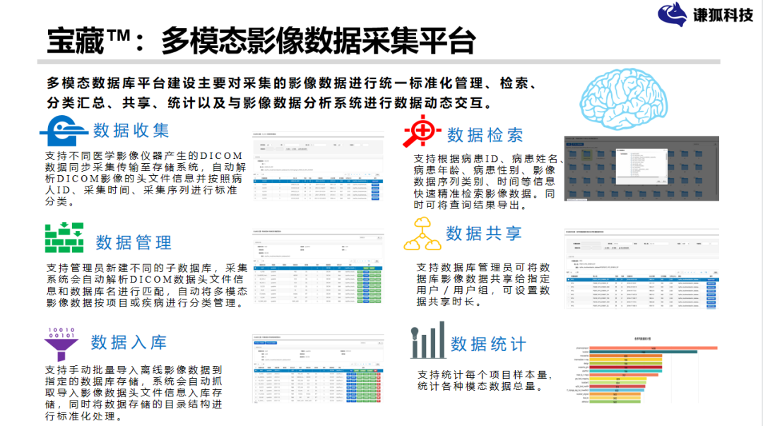 我们基于这样的背景,基于脑影像数据,因为医院或者脑疾病的数据80%都是脑影像的数据,我们基于脑影像数据为基础的数据库,再结合我们疾病相关的,认知评估、行为量表、临床信息等其他模态的数据,进行整体的管理、融合之后,利用我们后面分析的算法,为我们脑疾病和相关的一些诊断助力。