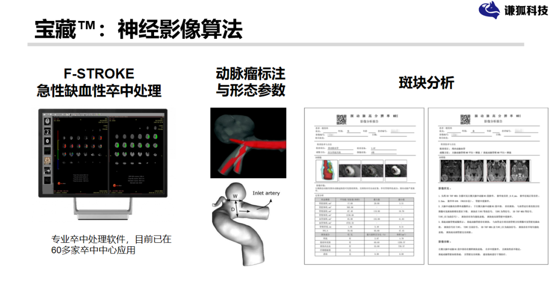 我们还做了一个跟中山医院合作的,主要针对脑卒中这一块,目前已经在很多单位得到应用了。在公立医院,他们做脑卒中,扫描影像数据,传到后端平台,进行分析,得到结构化的报告。这个结构化的报告跟医院HIS系统打通的,我们可以知道哪个医生看了哪些病,相关医生只能看到他相关病人的。