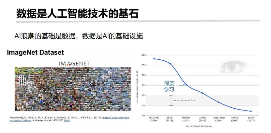 大家知道现在人工智能很热点,人工智能里面很重要的一个是数据,做相关的人工智能研究的都知道一个数据是ImageNet,这个数据库2010年开始,各类竞赛都在用这个数据库。但是在以前大家用传统的分析方法,量没有那么高的时候,识别率大概70%左右。但是我们人类识别的极限大概是90%—95%之间。在2016年,大家知道AlphaGo战胜李世石之后,深度学习的算法,人工智能的热点又起来了,基于这个算法,后面的数据量也不断地提升,深度学习方法,ImageNet相关的识别率超过人的识别准确率。