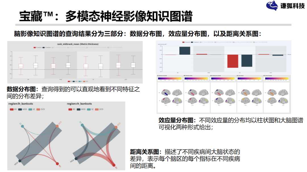 不同的效应量的展示,一个是柱状图、一个是大脑图谱。还有我们会描述不同疾病大脑状态之间的差异,我们看到选择不同的疾病,每个脑区对应指标的情况下之间距离的差距,距离越远,大家看到这个线条,越粗代表距离越近,越细相当于在指标上面的差异也就越大,这相当于大家通过图表的方式可以直观的看到相关的我们感兴趣的结果。